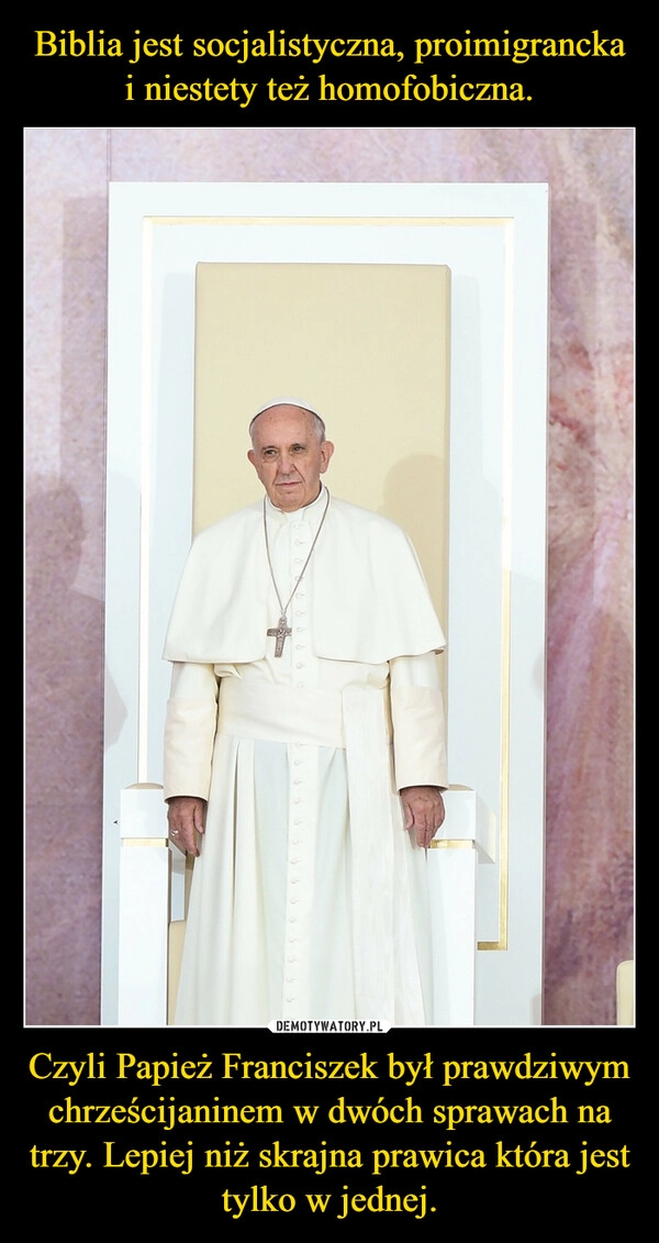 Biblia jest socjalistyczna, proimigrancka i niestety też homofobiczna. Czyli Papież Franciszek był prawdziwym chrześcijaninem w dwóch sprawach na trzy. Lepiej niż skrajna prawica która jest tylko w jednej.