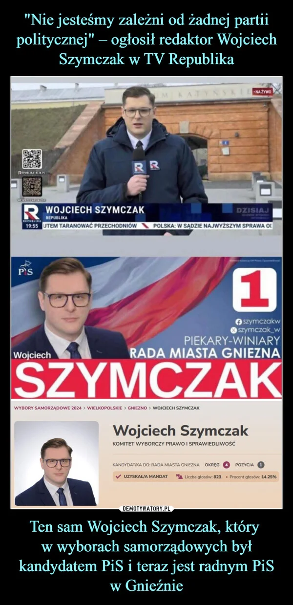 "Nie jesteśmy zależni od żadnej partii politycznej" – ogłosił redaktor Wojciech Szymczak w TV Republika Ten sam Wojciech Szymczak, który w wyborach samorządowych był kandydatem PiS i teraz jest radnym PiS w Gnieźnie