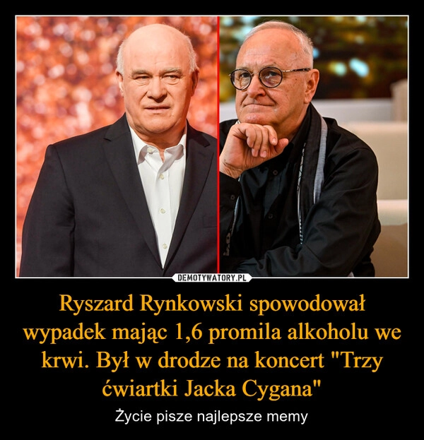 Ryszard Rynkowski spowodował wypadek mając 1,6 promila alkoholu we krwi. Był w drodze na koncert "Trzy ćwiartki Jacka Cygana"