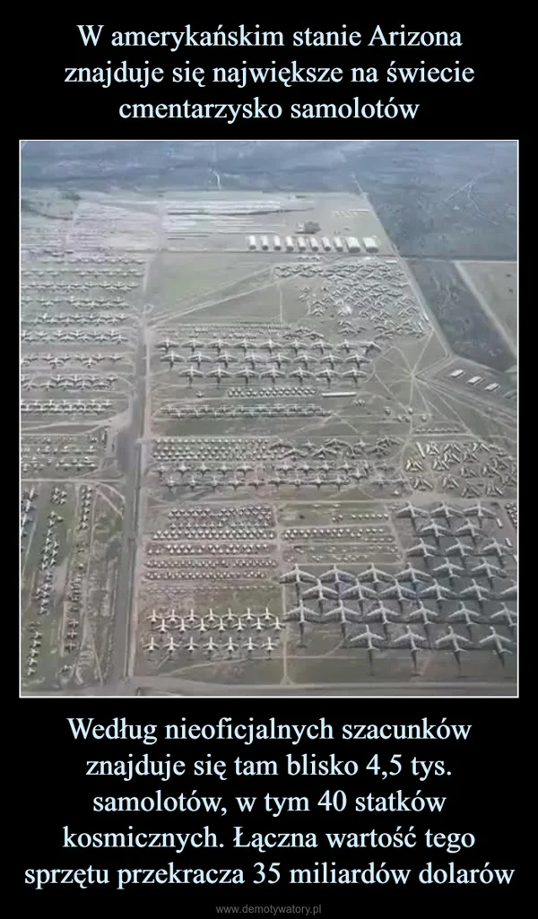 W amerykańskim stanie Arizona znajduje się największe na świecie cmentarzysko samolotów Według nieoficjalnych szacunków znajduje się tam blisko 4,5 tys. samolotów, w tym 40 statków kosmicznych. Łączna wartość tego sprzętu przekracza 35 miliardów dolarów