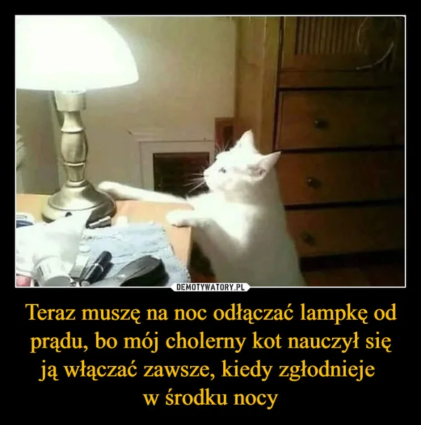 Teraz muszę na noc odłączać lampkę od prądu, bo mój cholerny kot nauczył się ją włączać zawsze, kiedy zgłodnieje w środku nocy