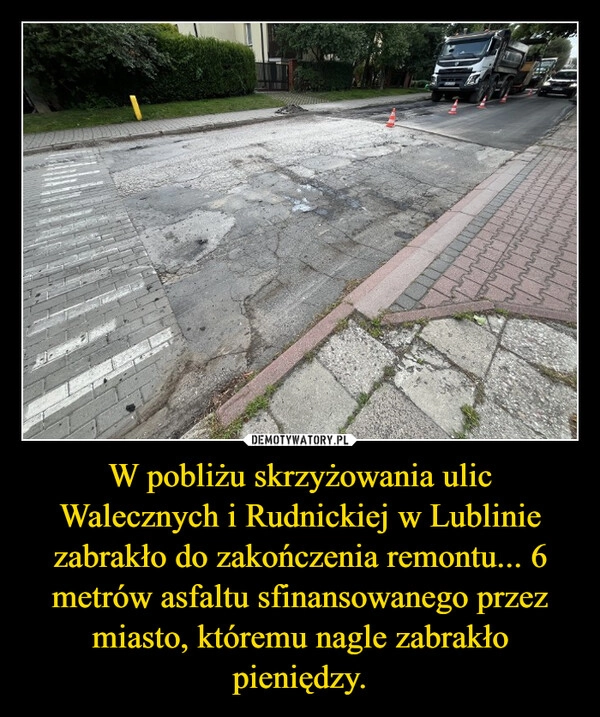 W pobliżu skrzyżowania ulic Walecznych i Rudnickiej w Lublinie zabrakło do zakończenia remontu... 6 metrów asfaltu sfinansowanego przez miasto, któremu nagle zabrakło pieniędzy.
