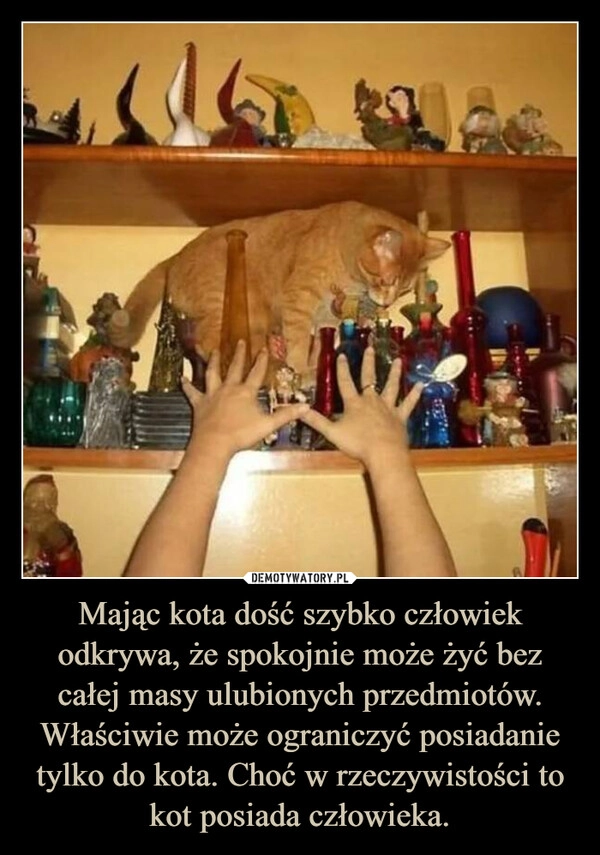 Mając kota dość szybko człowiek odkrywa, że spokojnie może żyć bez całej masy ulubionych przedmiotów. Właściwie może ograniczyć posiadanie tylko do kota. Choć w rzeczywistości to kot posiada człowieka.