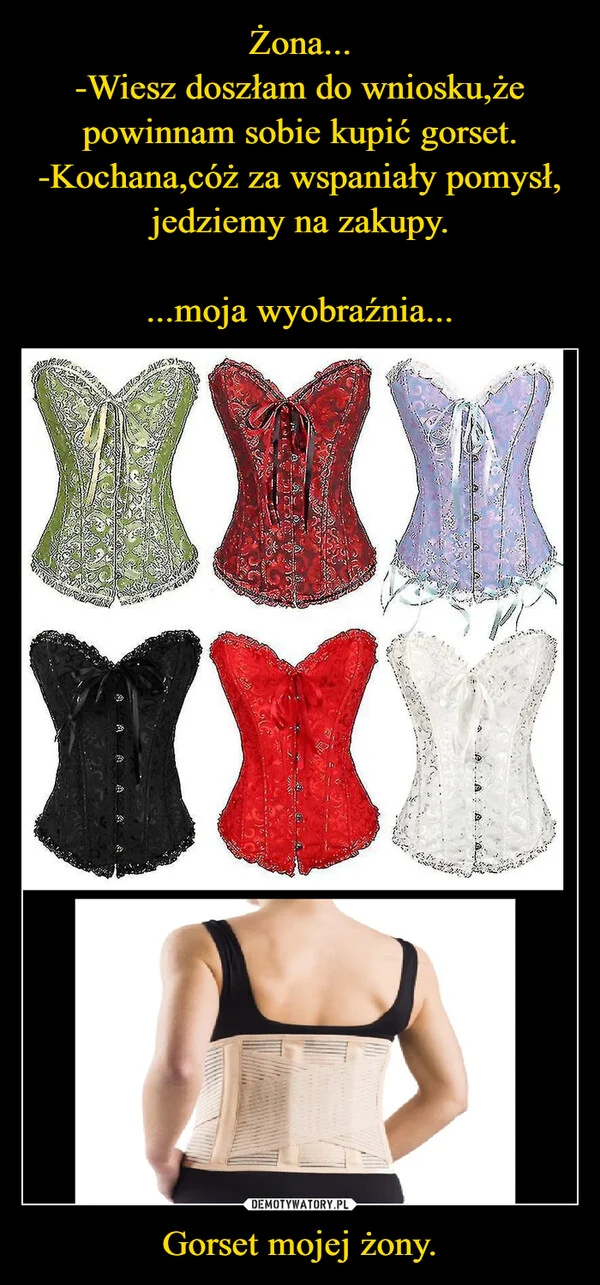 Żona... -Wiesz doszłam do wniosku,że powinnam sobie kupić gorset. -Kochana,cóż za wspaniały pomysł, jedziemy na zakupy. ...moja wyobraźnia... Gorset mojej żony.