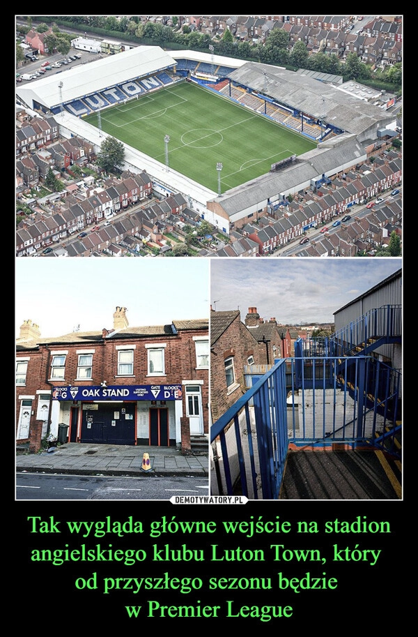 Tak wygląda główne wejście na stadion angielskiego klubu Luton Town, który od przyszłego sezonu będzie w Premier League