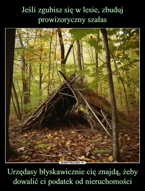 Jeśli zgubisz się w lesie, zbuduj prowizoryczny szałas Urzędasy błyskawicznie cię znajdą, żeby dowalić ci podatek od nieruchomości