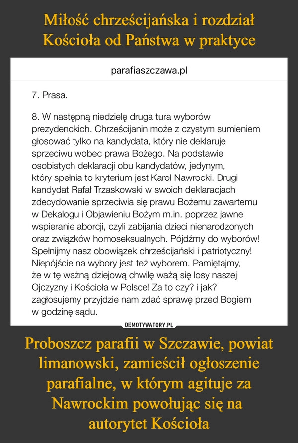 Miłość chrześcijańska i rozdział Kościoła od Państwa w praktyce Proboszcz parafii w Szczawie, powiat limanowski, zamieścił ogłoszenie parafialne, w którym agituje za Nawrockim powołując się na autorytet Kościoła