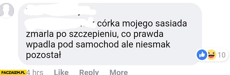 Córka mojego sąsiada zmarła po szczepieniu, co prawda wpadła pod samochód ale niesmak pozostał