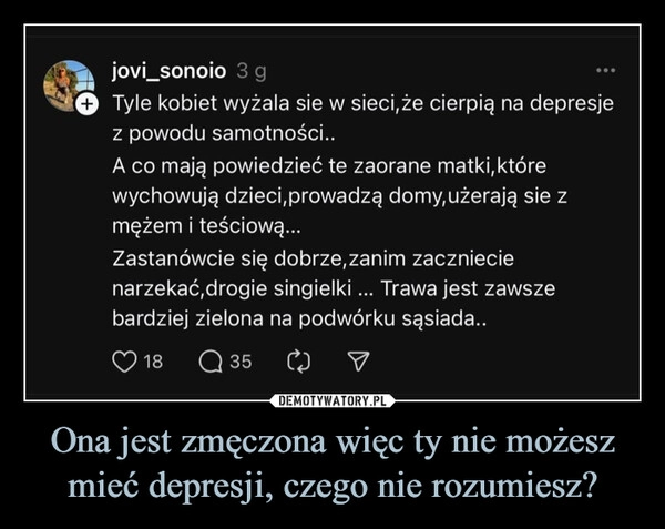 Ona jest zmęczona więc ty nie możesz mieć depresji, czego nie rozumiesz?