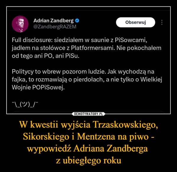 W kwestii wyjścia Trzaskowskiego, Sikorskiego i Mentzena na piwo - wypowiedź Adriana Zandberga z ubiegłego roku