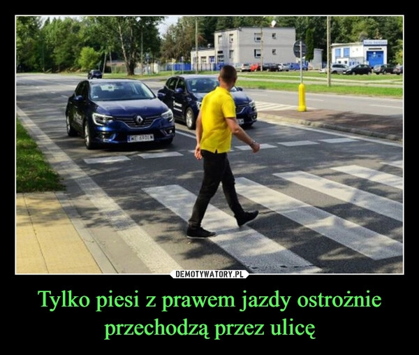 Tylko piesi z prawem jazdy ostrożnie przechodzą przez ulicę