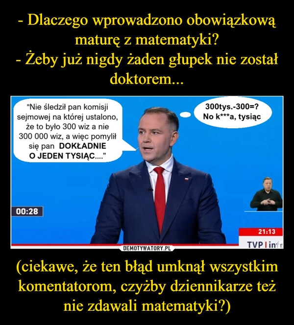 - Dlaczego wprowadzono obowiązkową maturę z matematyki? - Żeby już nigdy żaden głupek nie został doktorem... (ciekawe, że ten błąd umknął wszystkim komentatorom, czyżby dziennikarze też nie zdawali matematyki?)