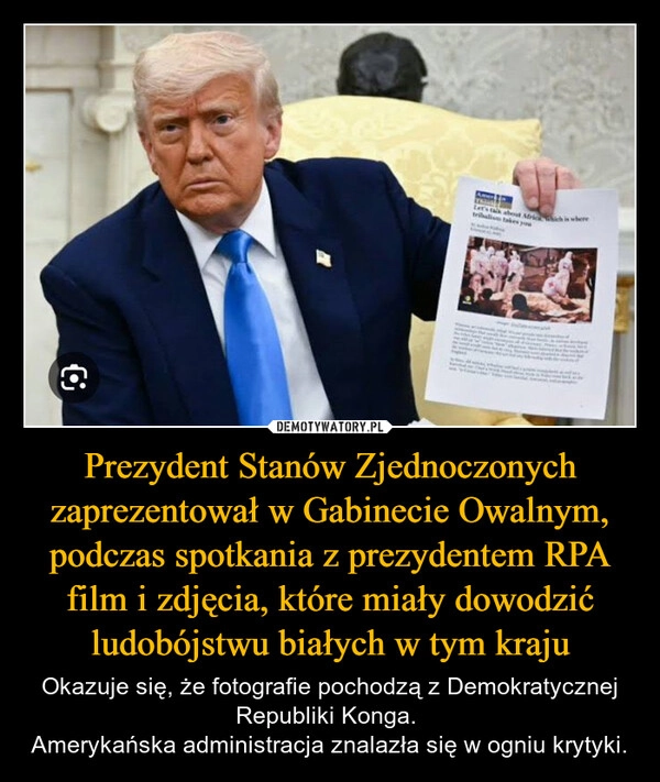 Prezydent Stanów Zjednoczonych zaprezentował w Gabinecie Owalnym, podczas spotkania z prezydentem RPA film i zdjęcia, które miały dowodzić ludobójstwu białych w tym kraju