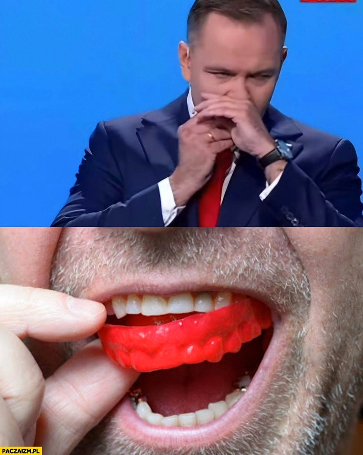 Nawrocki na debacie zakłada ochraniacz na zęby szczękę