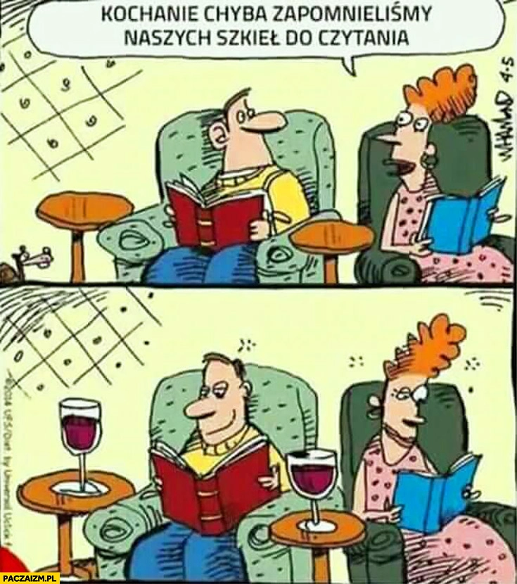 Kochanie chyba zapomnieliśmy naszych szkieł do czytania pija wino