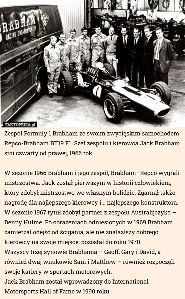 Zespół Formuły 1 Brabham ze swoim zwycięskim samochodem Repco-Brabham BT19...