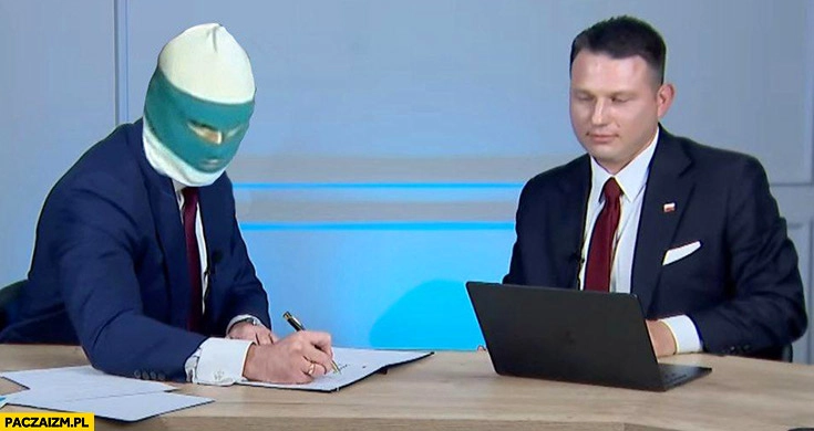 Nawrocki u Mentzena w kominiarce podpisuje zobowiązanie pakt Toruński