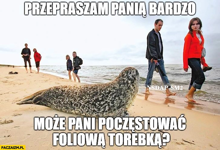 Foka na plaży przepraszam panią bardzo może pani poczęstować torebką foliowa
