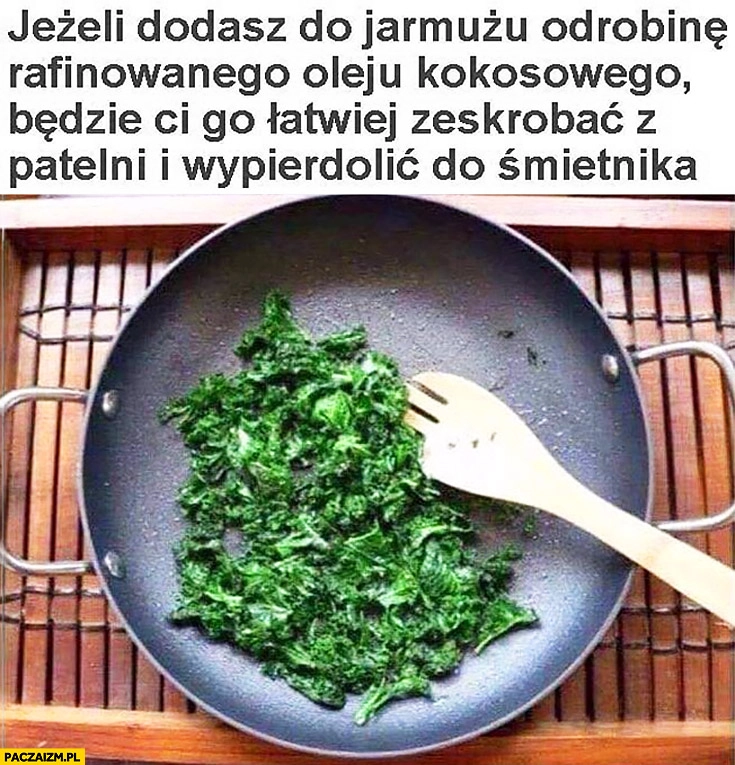 Jeżeli dodasz do jarmużu odrobinę rafinowanego oleju kokosowego będzie Ci go łatwiej zeskrobać z patelni i wywalić do śmietnika