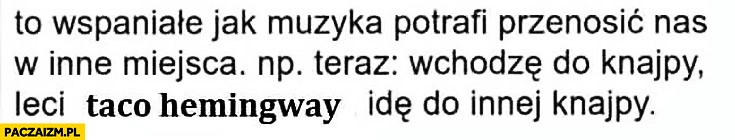 To wspaniałe jak muzyka potrafi przenosić nas w inne miejsca np. teraz wchodzę do knajpy leci Taco Hemingway, idę do innej knajpy