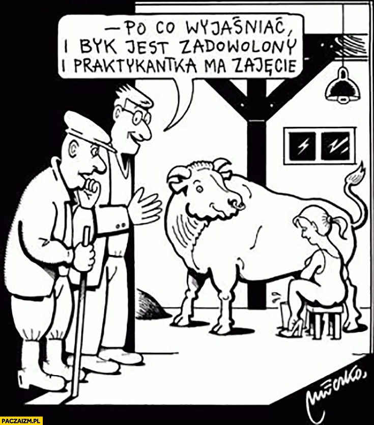 Po co wyjaśniac i byk jest zadowolony i praktykantka ma zajęcie dojenie Mleczko