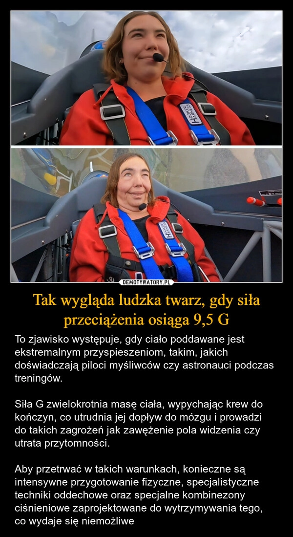 Tak wygląda ludzka twarz, gdy siła przeciążenia osiąga 9,5 G