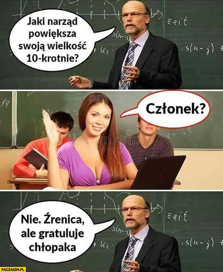 Nauczyciel pyta: jaki narząd powiększa swoją wielkość 10-krotnie? Członek laska odpowiada, nie, źrenica ale gratuluję chłopaka