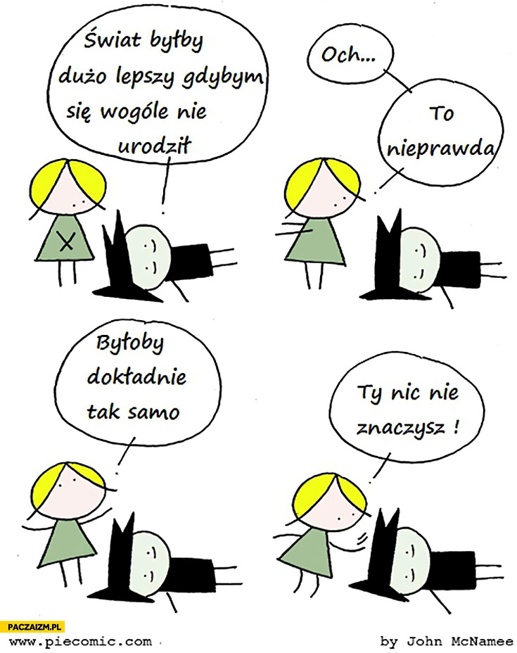 Świat byłby dużo lepszy gdybym w ogóle się nie urodził. To nieprawda, byłoby dokładnie tak samo, Ty nic nie znaczysz
