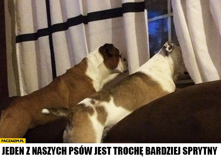Psy patrzą przez okno przez firankę jeden z naszych psów jest trochę bardziej sprytny