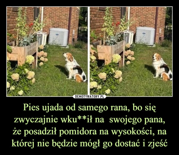 Pies ujada od samego rana, bo się zwyczajnie wku**ił na swojego pana, że posadził pomidora na wysokości, na której nie będzie mógł go dostać i zjeść