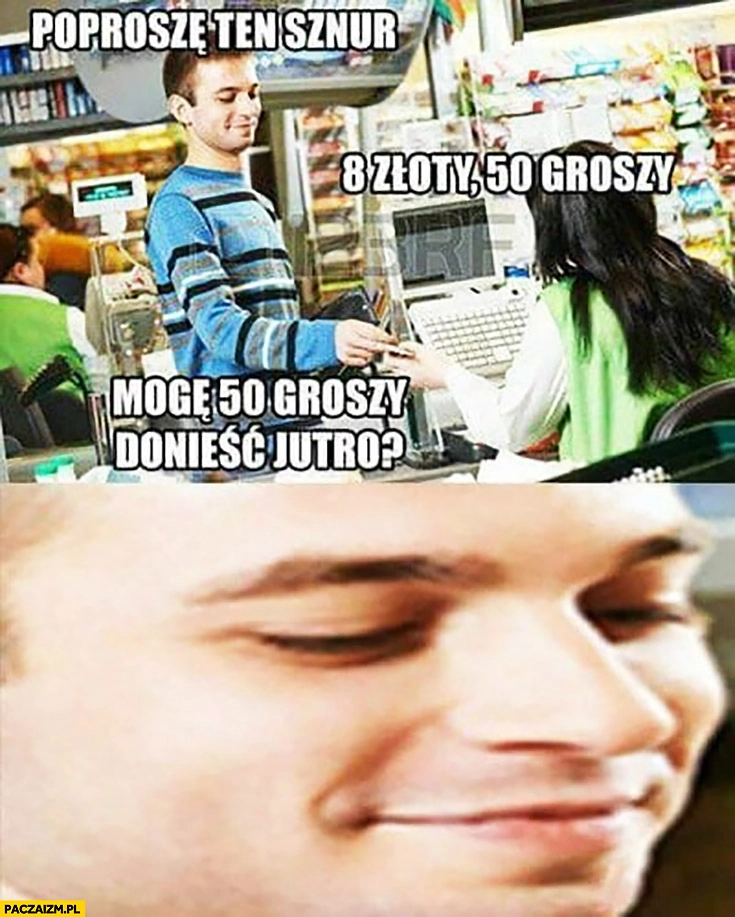 Poproszę ten sznur, 8 złotych 50 groszy, mogę 50 groszy donieść jutro? Samobójca