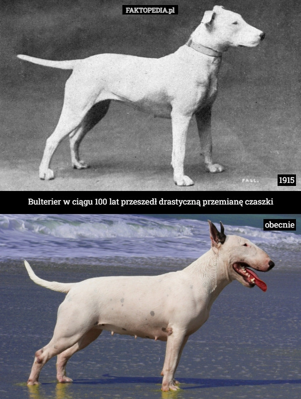 Bulterier na przestrzeni 100 lat przeszedł drastyczną przemianę czaszki.