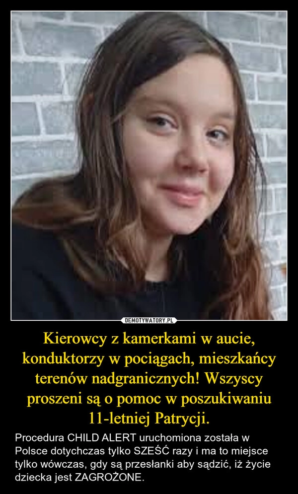 Kierowcy z kamerkami w aucie, konduktorzy w pociągach, mieszkańcy terenów nadgranicznych! Wszyscy proszeni są o pomoc w poszukiwaniu 11-letniej Patrycji.