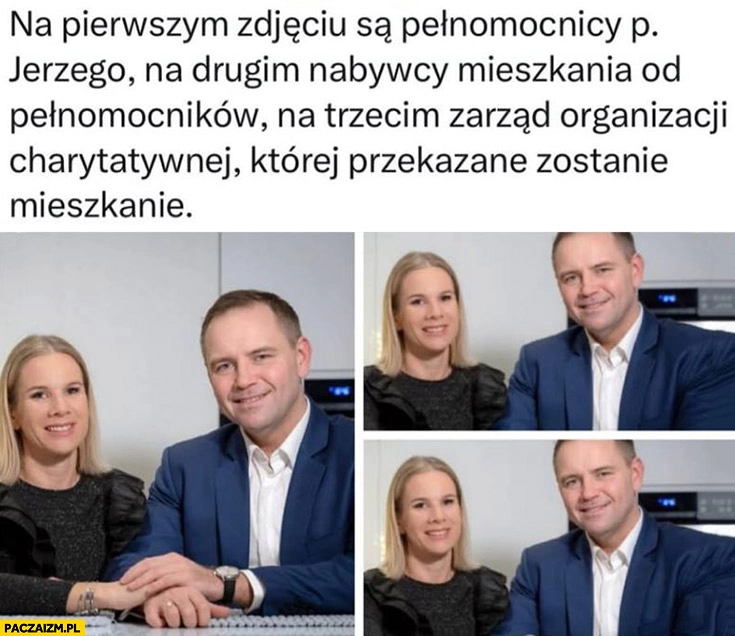 Nawrocki z żoną na pierwszym zdjęciu pełnomocnicy pana Jerzego, na drugim nabywcy mieszkania, na trzecim zarząd organizacji charytatywnej