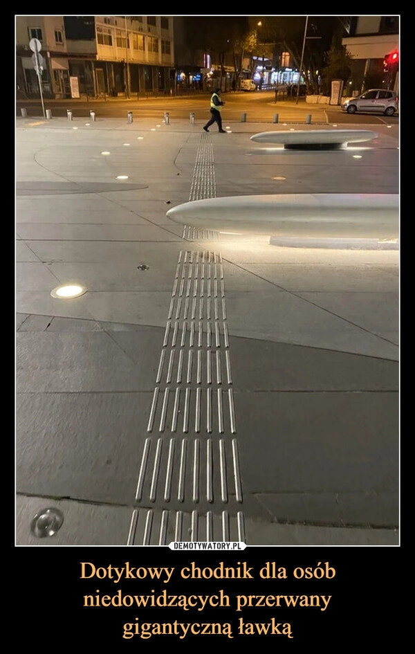 Dotykowy chodnik dla osób niedowidzących przerwany gigantyczną ławką