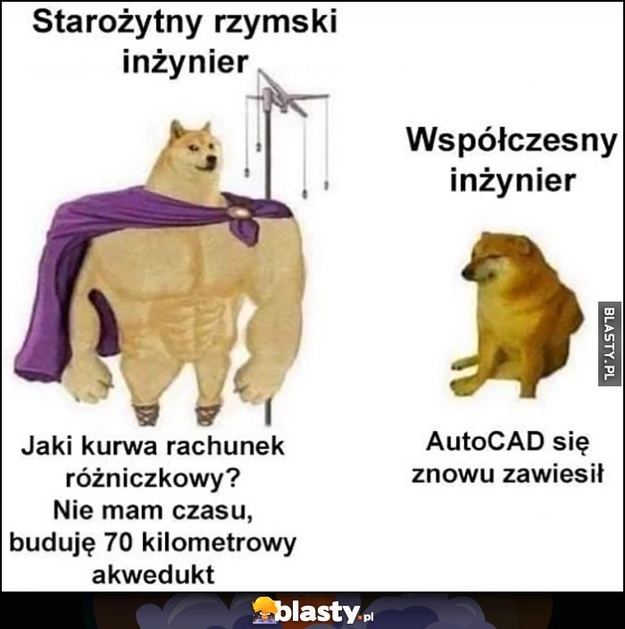 Starożytny rzymski inżynier: jaki rachunek różniczkowy, nie mam czasu buduję 70 kilometrowy akwedukt vs współczesny: autoCAD się znowu zawiesił pies pieseł doge