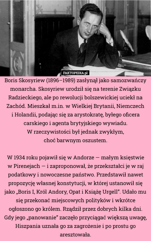 Boris Skosyriew (1896–1989) zasłynął jako samozwańczy monarcha. Skosyriew