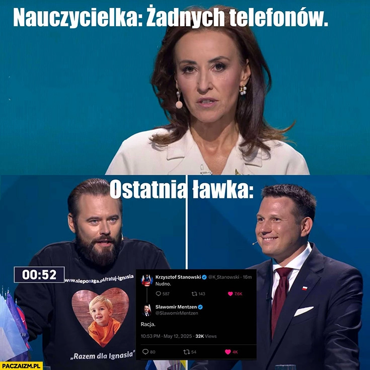 Nauczycielka: żadnych telefonów, ostatnia ławka: Stanowski Mentzen nuda, racja debata TVP