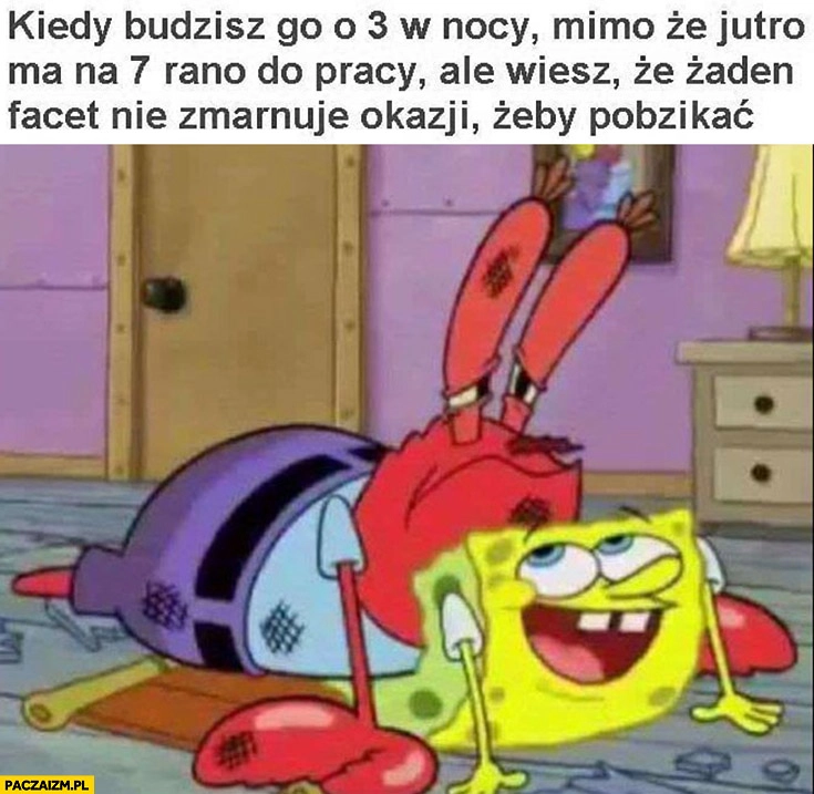 Kiedy budzisz go o 3 w nocy mimo, że jutro ma na 7 rano do pracy ale wiesz, że żaden facet nie zmarnuje okazji żeby pobzikać Spongebob