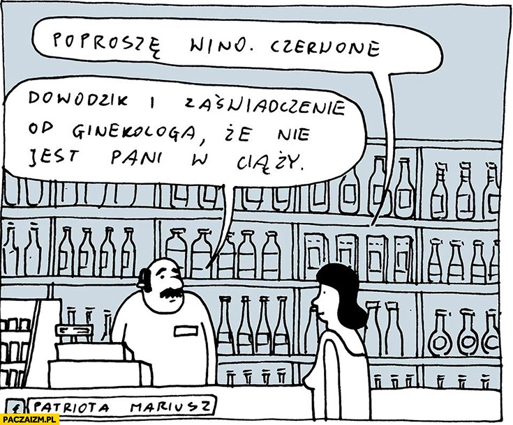 Poproszę wino czerwone. Dowodzik i zaświadczenie od ginekologa, że nie jest pani w ciąży. Patriota Mariusz