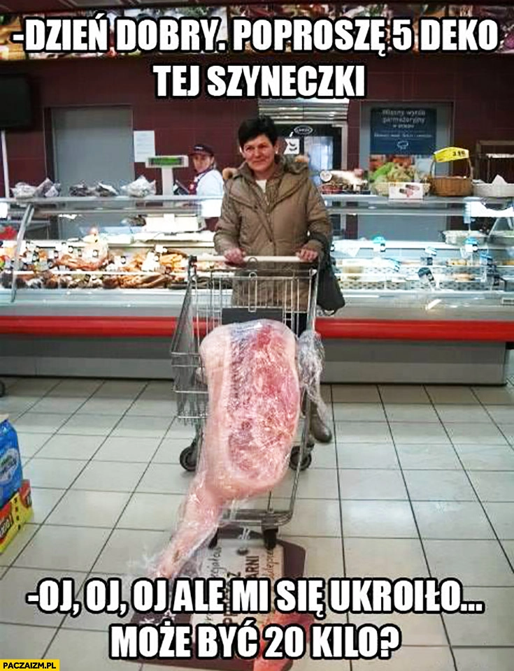 Dzień dobry poproszę 5 deko tej szyneczki, oj ale mi się ukroiło może być 20 kilo