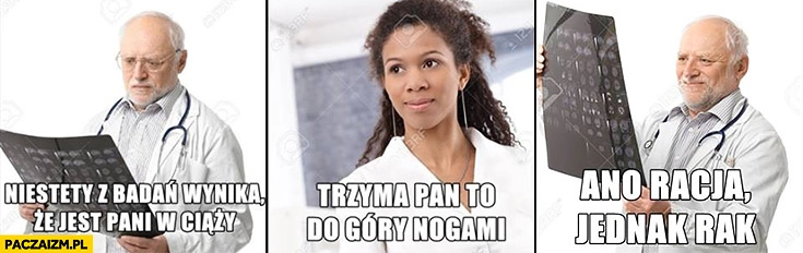 Niestety z badań wynika, że jest pani w ciąży, trzyma pan to do góry nogami, ano racja jednak rak. Dziwny pan ze stocku