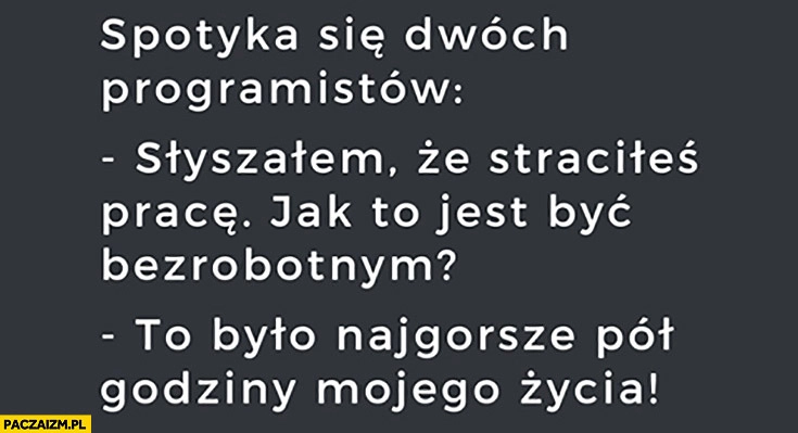 Spotyka się dwóch programistów słyszałem, że straciłeś pracę, jak to jest być bezrobotnym? To było najgorsze pol godziny mojego życia