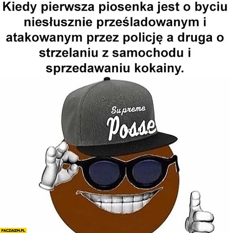 Typowy czarny raper: kiedy pierwsza piosenka jest o byciu niesłusznie prześladowanym i atakowanym przez policję, a druga o strzelaniu z samochodu i sprzedawaniu kokainy
