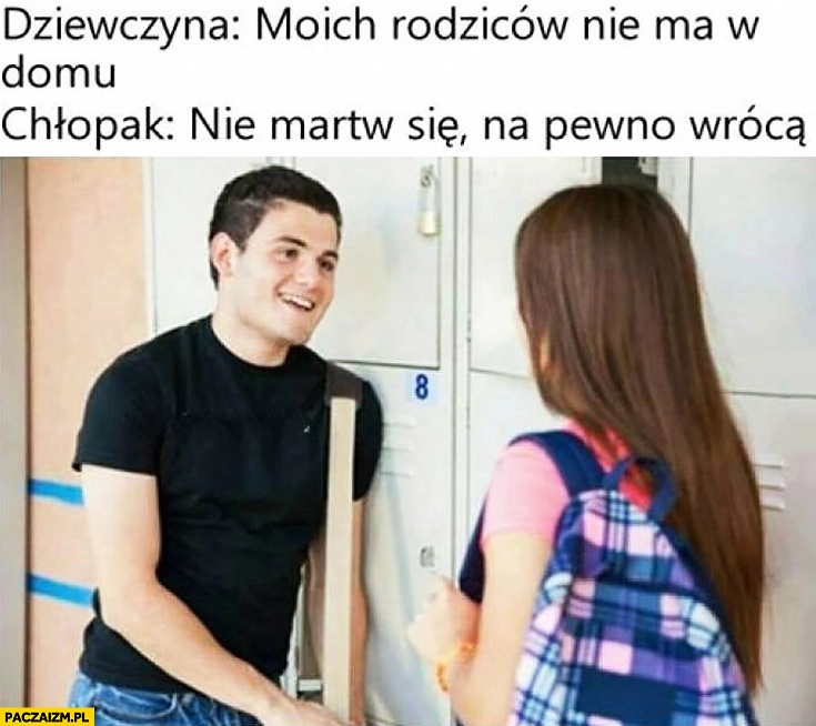 Dziewczyna: moich rodziców nie ma w domu. Chłopak: nie martw się, na pewno wrócą