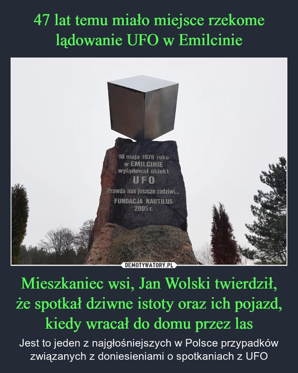 47 lat temu miało miejsce rzekome lądowanie UFO w Emilcinie Mieszkaniec wsi, Jan Wolski twierdził, że spotkał dziwne istoty oraz ich pojazd, kiedy wracał do domu przez las