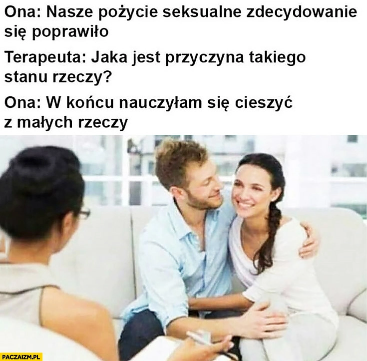 Ona: nasze pożycie seksualne zdecydowanie się poprawiło. Terapeuta: jaka jest przyczyna takiego stanu rzeczy? Ona: w końcu nauczyłam się cieszyć z małych rzeczy