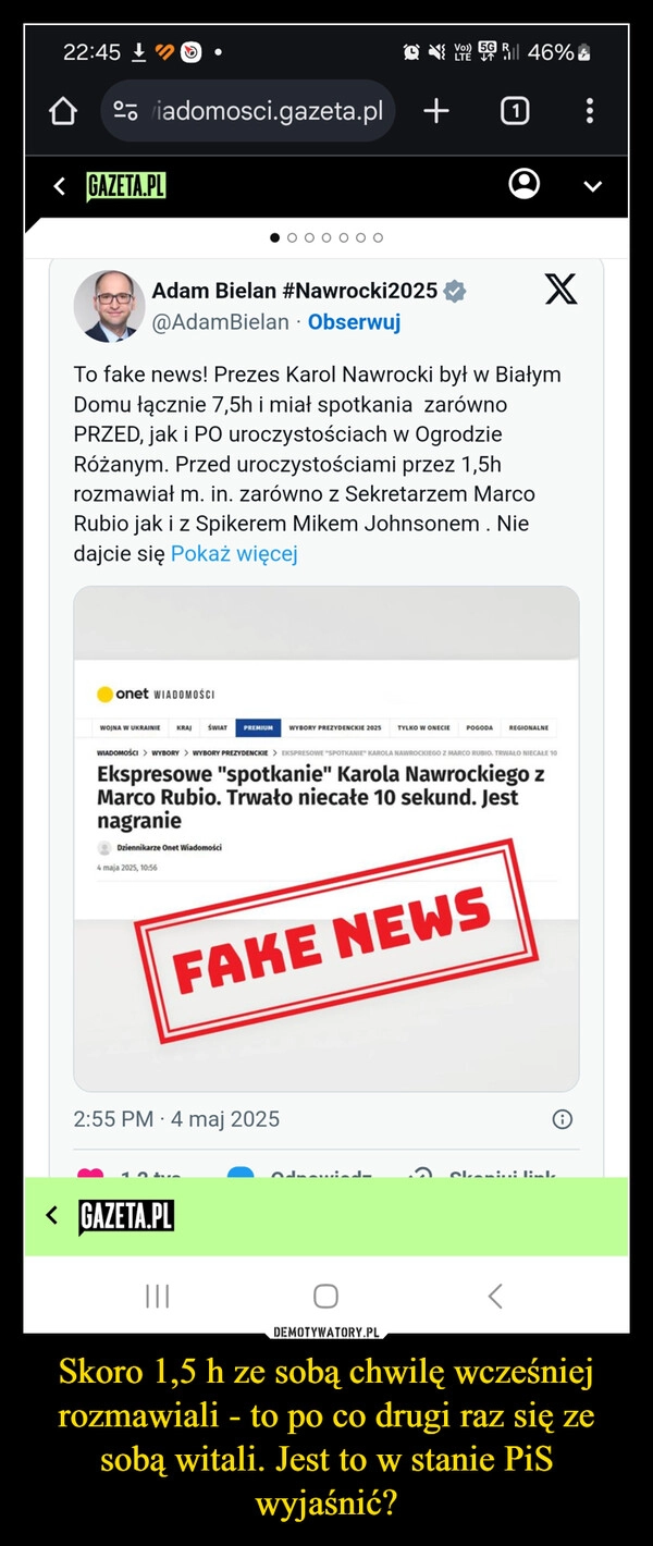 Skoro 1,5 h ze sobą chwilę wcześniej rozmawiali - to po co drugi raz się ze sobą witali. Jest to w stanie PiS wyjaśnić?