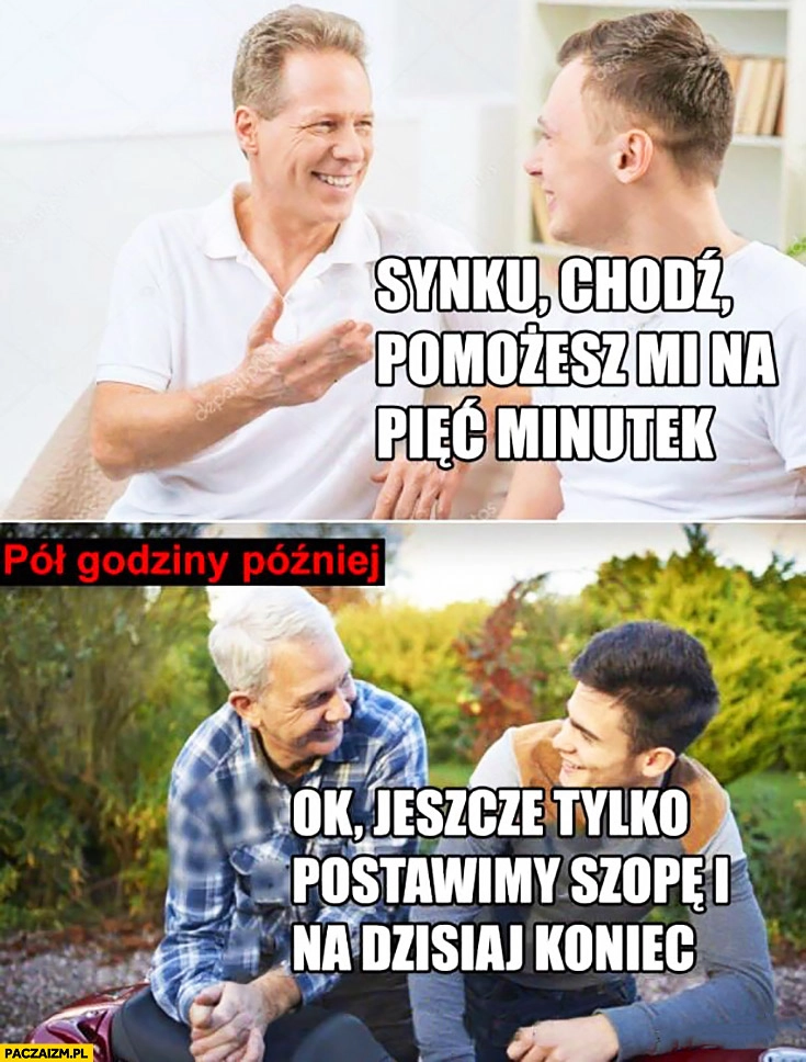 Synku chodź pomożesz mi na pięć minutek, pół godziny później jeszcze tylko postawimy szopę i na dzisiaj koniec tata ojciec syn