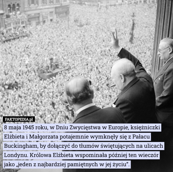 8 maja 1945 roku, w Dniu Zwycięstwa w Europie, księżniczki Elżbieta i Małgorzata...